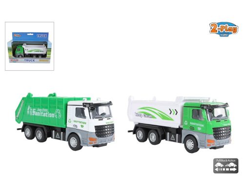 2-Play kiepwagen/vuilniswagen die cast pull back 15cm