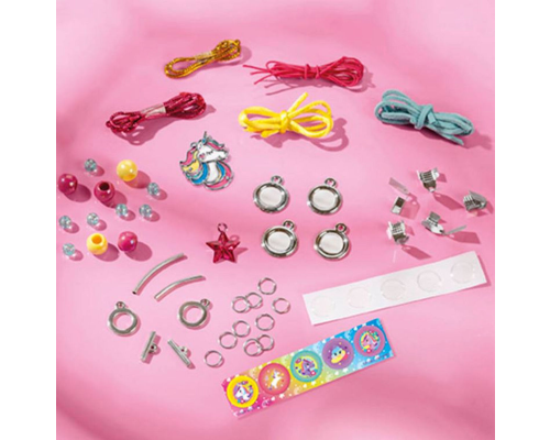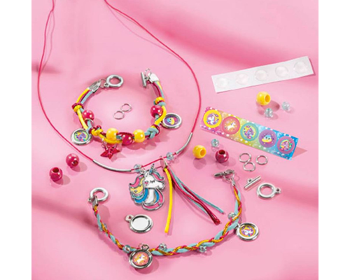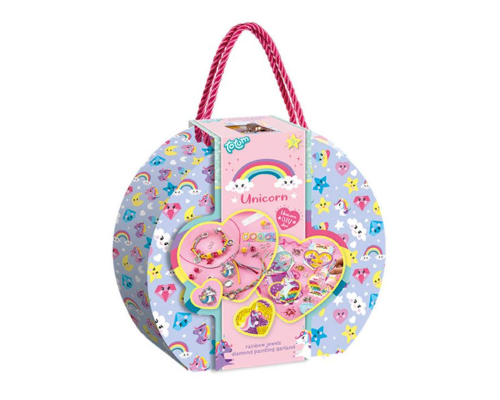 Unicorn 2 in 1 in herbruikbare bewaarkoffer met 2 knutsel activiteiten : maak je eigen eenhoorn armbanden en versier kaarten met strass steentjes incl. sorteerbakje.