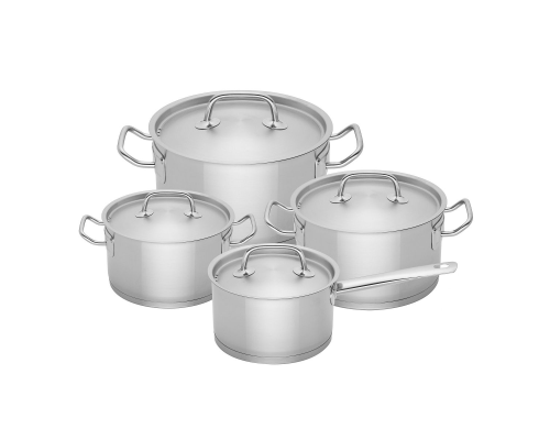 Deze pannenset heeft de uitstraling van een horecakeuken, maar dan thuis op je eigen fornuis, geschikt voor alle warmtebronnen, in de maten 16,18 en 20 cm met een steelpan van 16 cm.