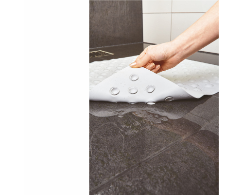 De mat voorkomt dat men uitglijdt, wanneer men in en uit bad of douche stapt. Wanneer men in bad zit biedt de badmat meer