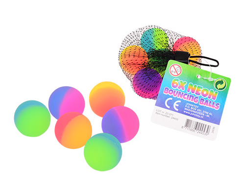 Twee kleurige neon stuiterballen in 6 stuks net, 3 assorti