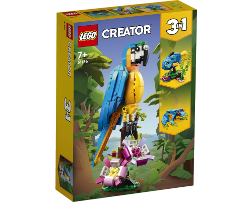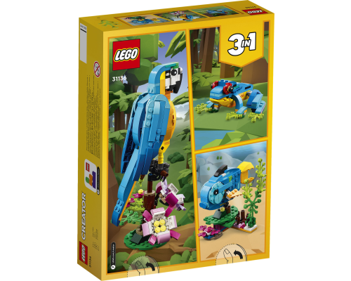 Trek het regenwoud in voor leuke avonturen met 3 exotische dieren! Je kunt een prachtige papegaai bouwen die op een boomtak zit, omringd door kleurrijke bloemen. Bouw hem vervolgens om tot een blauw-gele vis die in de zee zwemt of een coole kikker die zij