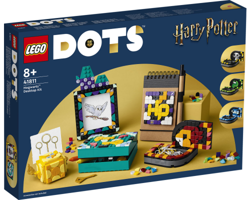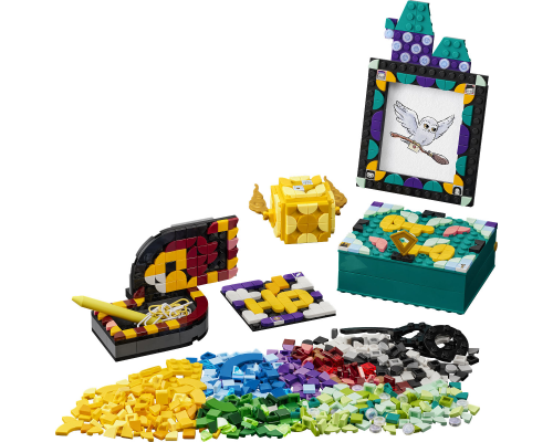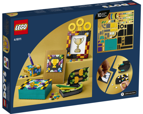 Keer terug naar Zweinstein! Vrolijk je bureau op met deze leuke LEGO DOTS set. Haal de onderdelen uit de doos, maak het fotolijstje (en kies je favoriete decoratieve extraatje), zet het bakje in de vorm van een afdelingssjaal, de Gouden Snaai notitiehoude