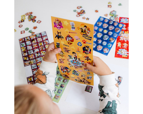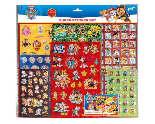 Paw Patrol super stickerset 36 x 38 cm. Bevat meer dan 300 stickers in verschillende vormen en formaten : 7 stickervellen in verschillende materialen en coole dessins met alle Paw Patrol helden, en 1 zakje met circa 100 laser stickers incl. 2 grote vellen
