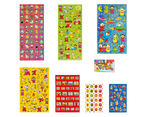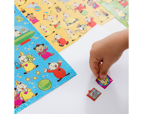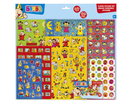 Bumba XL super stickerset 36 x 38 cm. Bevat meer dan 300 stickers in verschillende vormen en formaten: 7 stickervellen in verschillende materialen en vrolijke dessins en 1 zakje met circa 100 laser stickers incl. 2 grote vellen glitterstickers en 2 vellen