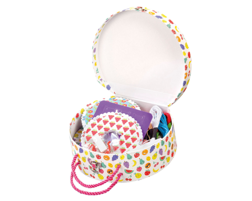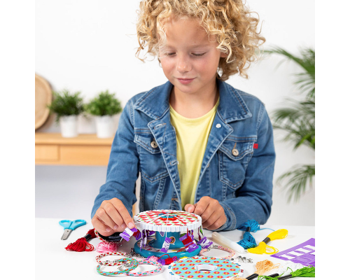 "Fashion armbandjes weefstudio. Met deze set kan je 3 katoenen armbanden maken. Met de tool creer je met behulp van verwisselbare patroonwielen verschillende motieven in de armbanden. Verpakt in een herbruikbare bewaarkoffer.