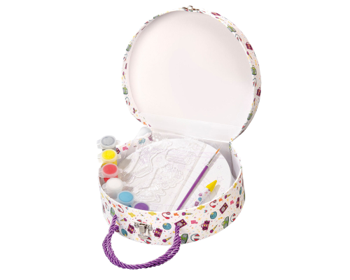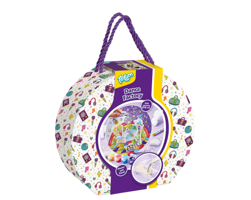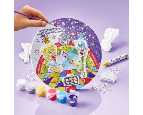 Canvas schilderijtje maken 18 cm met met gips figuren en disco / dansthema in regenboogkleuren. Incl. gips, mal, 6 kleuren verf, penseel, strass steentjes voor de disco bal verpakt in een herbruikbare bewaarkoffer._x00D_