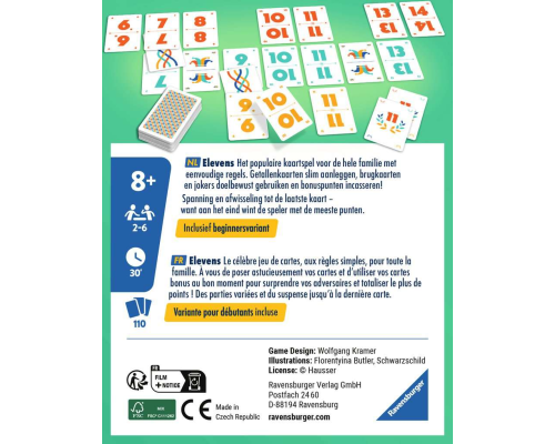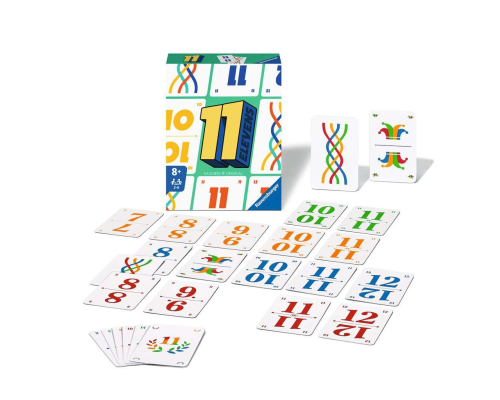 Elevens Het populaire kaartspel voor de hele familie met eenvoudige regels. Getallenkaarten slim aanleggen, brugkaarten en jokers doelbewust gebruiken en bonuspunten incasseren! Spanning en afwisseling tot de laatste kaart – want aan het eind wint de spe