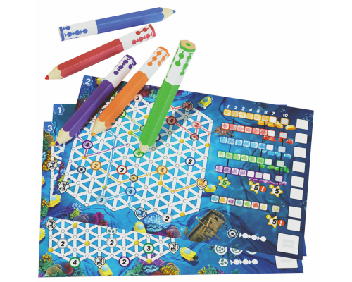 Verken de oceaan rond een gezonken schip en vorm routes van dezelfde kleur om schatten te bereiken, maar pas op voor verraderlijke draaikolken! Kies steeds 1 van de gerolde kleurpotloden en kleur een route van het op de betreffende zijde aangegeven aantal