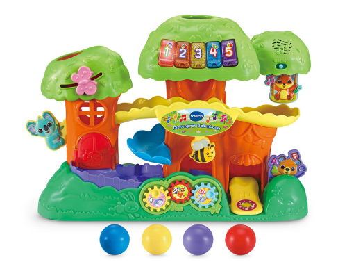 In dit gezellige boomhuis is iedereen welkom! Druk op de 5 knipperende toetsen en maak kennis met kleuren, cijfers en dieren. Plaats de ballen in de boom, beweeg de koala, open de deur of druk op de wip om de ballen te lanceren en zie ze rollen van hier