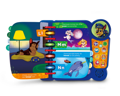 Open het boek en maak spelenderwijs kennis met de letters van het alfabet, de letterklanken en verschillende woorden. Ontdek op elke bladzijde zinnen uit bekende PAW Patrol avonturen en druk op de toetsen om vrolijke reacties te horen, naar muziek te lui