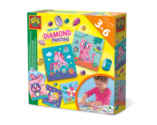 Diamond painting, ook voor de allerkleinsten! Met deze supermooie mega diamant stickers worden de mooiste diamond paintings gemaakt. De extra grote stenen zijn zelfklevend en kunnen op de 6 vrolijke kaarten worden geplakt. Maak jij eerst een glinsterende