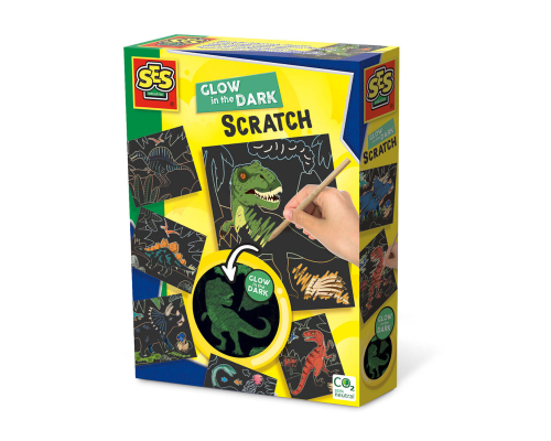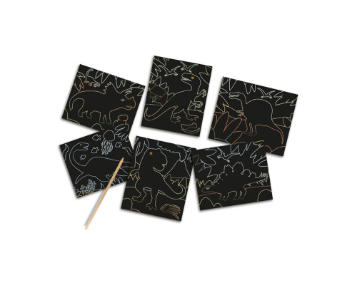 Scratchkaarten met een heel bijzonder effect! Deze glow in de dark scratchkaarten laten een voor een verschillende dino's zien! Met de houten kraspen kunnen kinderen ze een voor een tevoorschijn toveren.