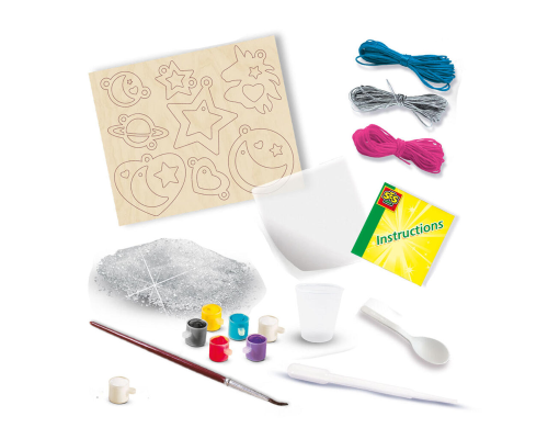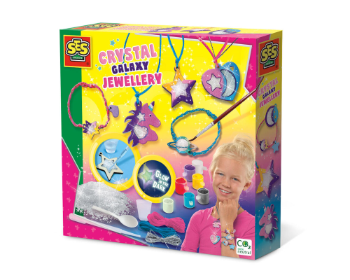 Met galaxy kristalsieraden kunnen kinderen supermooie sieraden maken, geheel in galaxy thema. De houten bedels kunnen versierd en beschilderd worden. Met de kristalkorrels en glow in de dark verf kunnen unieke sieraden met bedels gemaakt worden.