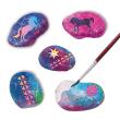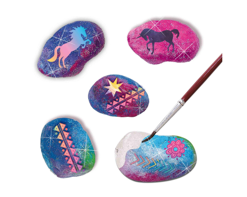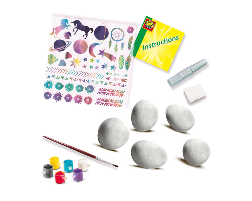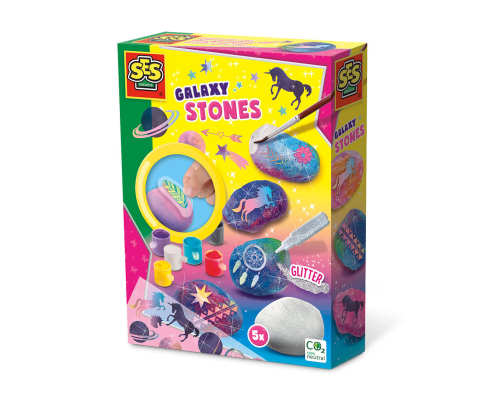 De stenen zijn met de toffe rub on stickers en verf om te toveren tot magische galaxy stenen. Kinderen kunnen de 5 stenen helemaal naar eigen creativiteit omtoveren en met de glitter worden de stenen helemaal afgemaakt.