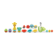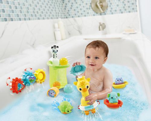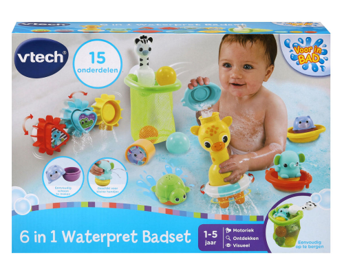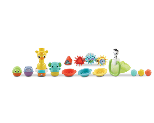 Spetter-de-spet wat een waterpret! 15 onderdelen voor eindeloos speelplezier in bad. Giet water in de giraffe en zie hoe hij ronddraait in het water. Stapel de bootjes of haak ze aan elkaar vast om een boottreintje te maken. Knijp in het olifantje om wat