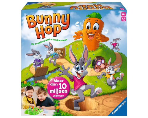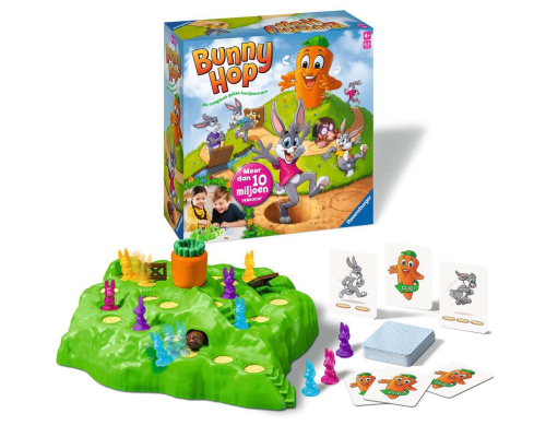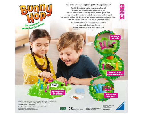 Inhoud: 1 spelbord, 16 konijngen in 4 kleuren, 48 actiekaarten, spelregels.