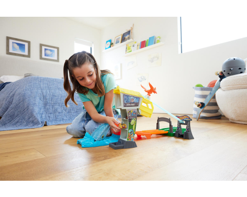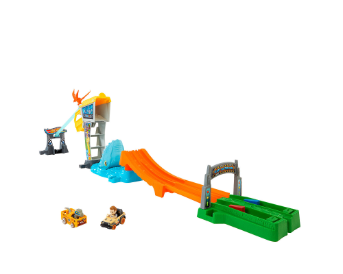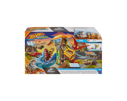 Twee tegenstanders in de race om van het Jurassic World eiland te ontsnappen op deze Hot Wheels RacerVerse baanset met een dragrace en een tokkelbaan voor de finish. De set bevat metalen racers Blue de Raptor en Owen, met niet-uitneembare figuren achter h