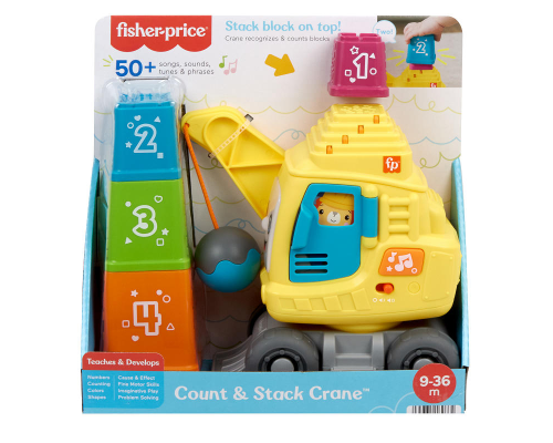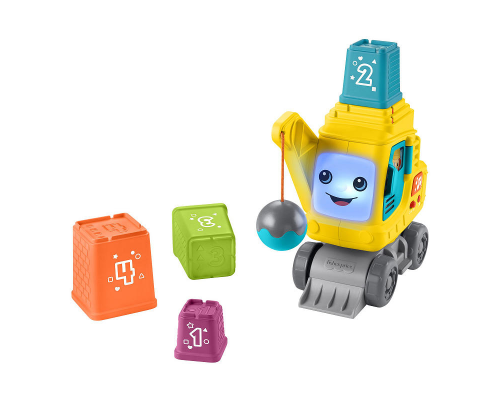 Het plezier zal zich opstapelen voor baby's en peuters met het constructiespeelgoed Tel- en Stapelkraan van Fisher-Price. Deze met de hand te rollen bulldozerkraan herkent elk van de 4 genummerde blokken en licht op met leuke geluidjes en zinnetjes wannee
