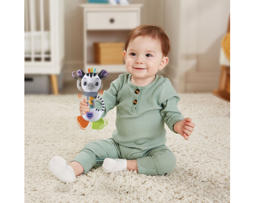 Laten we schudden en rammelen met deze schattige zebra! Het pluche hoofd met lintjes en de knisperende oren stimuleren de tastzin. Rammel de zebra om de kleurrijke kraaltjes te zien bewegen. De pootjes zijn geschikt om op te bijten en verzachten de pijn
