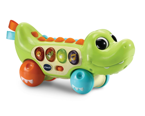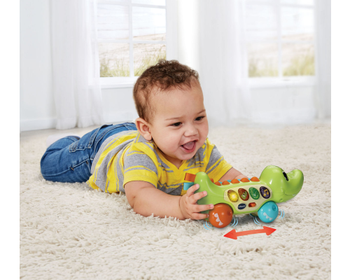 Tijd voor een vrolijk avontuur! Rol de krokodil vooruit om zijn ogen te zien draaien en grappige geluiden te horen. Druk op de toetsen om vrolijke reacties te horen en zie de lichtjes knipperen. De lintjes aan de staart en de stekels van zacht rubber sti