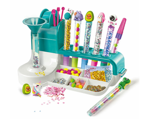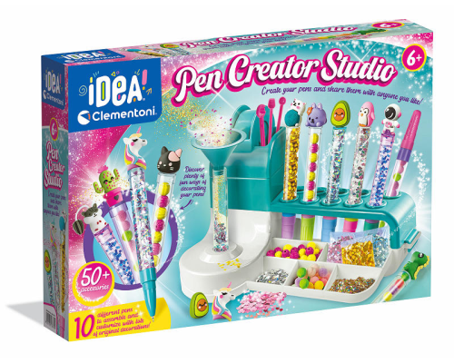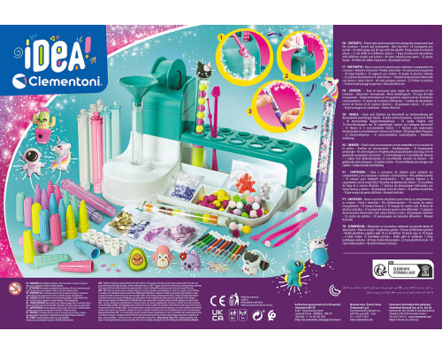 Clementoni iDea's pennencreatiestudio laat je kind zijn of haar unieke eigen pennen ontwerpen. Het creatieve bloed stroomt terwijl ze fluffy pompons, glitters en schattige kawaii diertjes gebruiken om echte meesterwerkjes te maken. Het knutselpakket is vo