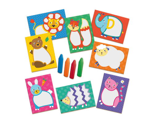 Een blije knutselervaring voor jonge kinderen en hun ouders! De 8 slimme klapkaarten zijn zo ontworpen dat jonge kinderen vrij kunnen krassen en toch een prachtig resultaat krijgen. Vouw na het kleuren eenvoudig de kaarten dicht en zie wat er gebeurd! De