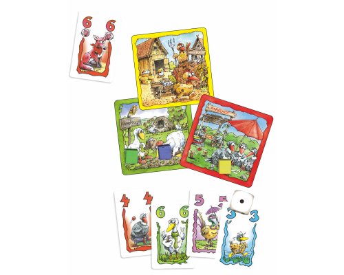Vlot blufspel voor het hele gezin! Het pluimvee op de boerderij houdt een groot buffet. De vossen uit de omgeving eten ook graag mee, maar die hebben duidelijk een ander beeld van de samenstelling van het menu. Speel pluimveekaarten om graankorrels te ver
