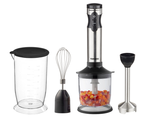 Met de Tomado TSB9001B staafmixerset mix, klop, hak, snijd en pureer je alle ingrediënten in een handomdraai. Deze staafmixerset is voorzien van een staafmixer, garde, maatbeker en een hakmolen met een inhoud van 500 ml. Het mes van zowel de staafmixervoe