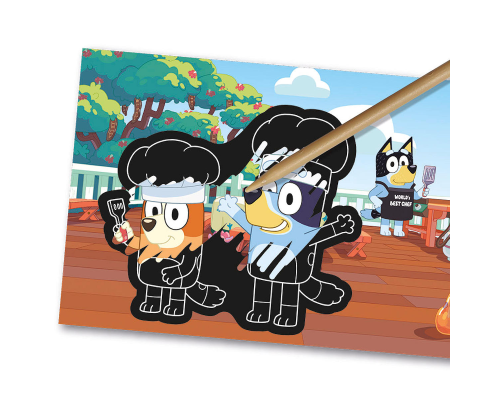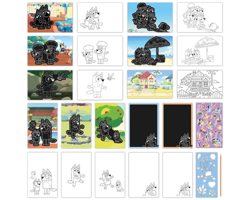 Bluey luxe krasboek met ringband en harde kaft. Maak 10 metallic kraskaarten inclusief stickers, achtergrond, 10 kleurplaten en kraspen