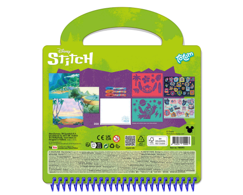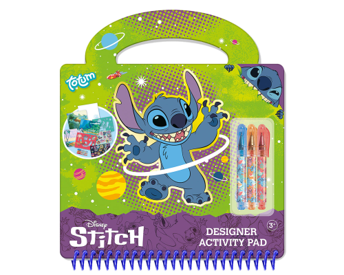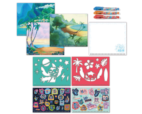 Stitch 30-delig designer teken- en activiteitenboek 20 pagina's inclusief 3 gelpennen, 2 stickervellen, 2 sjablonen. Met harde kaft, ringband, draaghandvat - voor thuis en onderweg