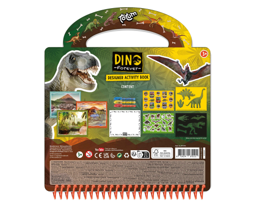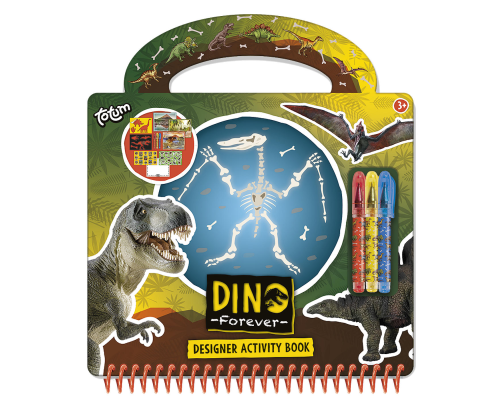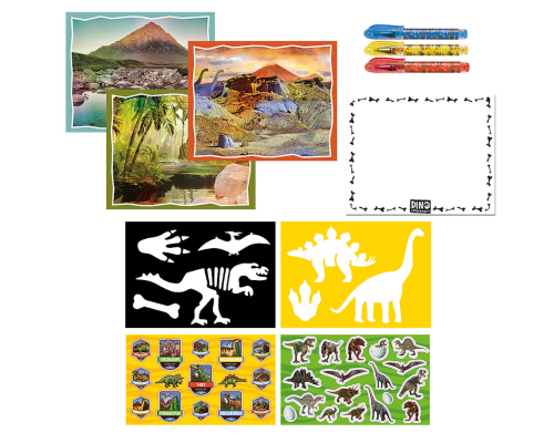 Dino 30-delig designer teken- en activiteitenboek 20 pagina's inclusief 3 gelpennen, 2 stickervellen, 2 sjablonen. Met harde kaft, ringband, draaghandvat, hersluitbaar met velcro sluiting - voor thuis en onderweg