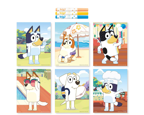 Bluey 6 kaarten van Bluey en zijn familie en vriendje versieren met 3 kleuren dot stiften