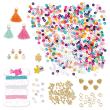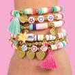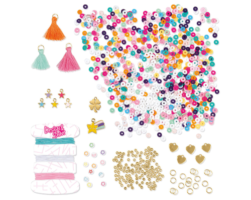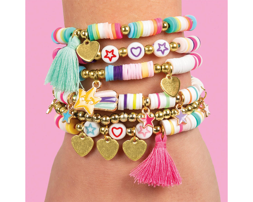 6 trendy armbandjes maken met 840 platte disc/heishi kralen, 3 tassels, 2 kleuren elastiek, 120 kleine goudkleurige kralen, 12 bedrukte kralen met hartje, ster, maan en bloem, 2 metalen bedels (ster en klavertje 4), 10 kleine metalen hart- en sterbedels m