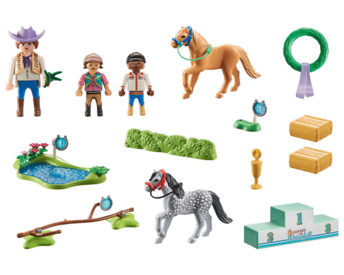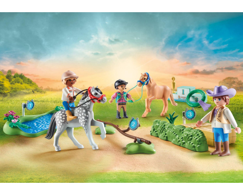 Gedetailleerde PLAYMOBIL Ponysporttoernooi met drie PLAYMOBIL-figuren en twee pony's. Inclusief een podium voor de prijsuitreiking, diverse hindernissen en andere accessoires met paardenthema.