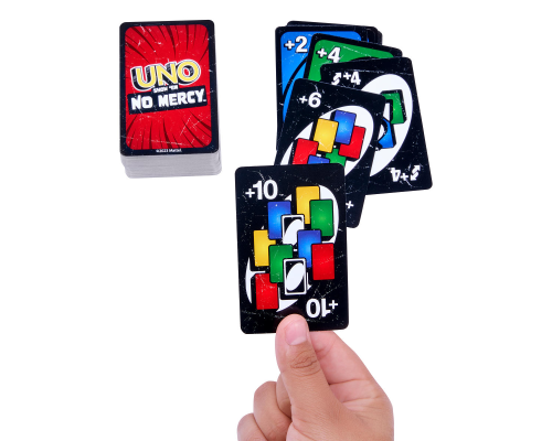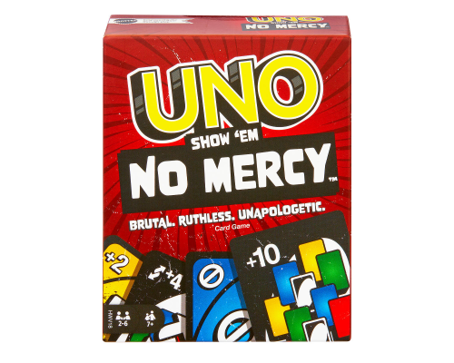 UNO Show 'em No Mercy is ons wreedste UNO spel ooit! Het spel heeft veel meer kaarten met VEEL strengere straffen (pak jij even 10 kaarten?) en nieuwe regels die ervoor zorgen dat spelers meer kaarten stapelen, ruilen en pakken dan ooit tevoren! En er is