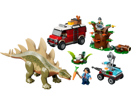 Inspireer jonge dinofans met een Stegosaurus, 2 minifiguren, een terreinwagen en meer in deze gedetailleerde LEGO Jurassic World set.