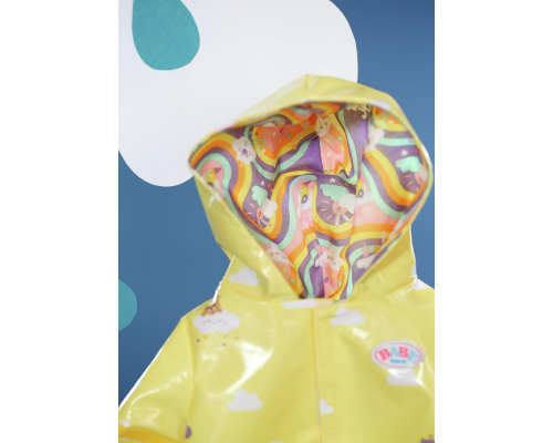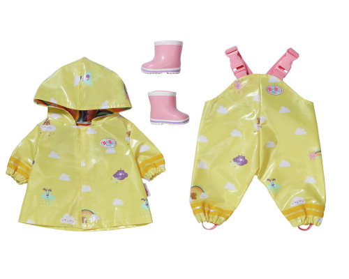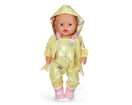 Het regent, het regent...' BABY born is dol op de regen. In haar roze regenlaarzen springt ze van plas naar plas en steekt haar tong uit om regendruppels op te vangen. Haar regenlaarzen passen perfect bij de gele regenjas met capuchon en haar waterbesten