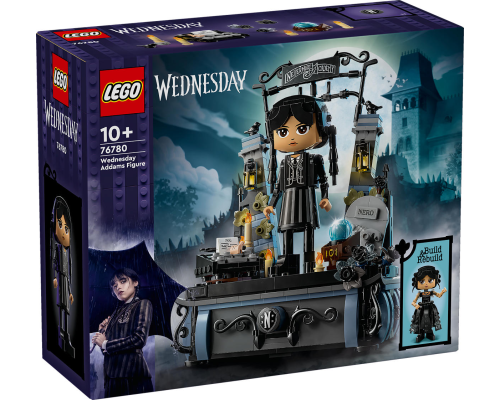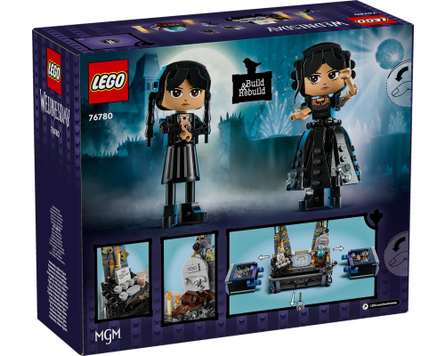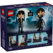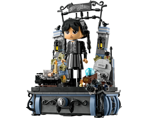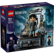 Wednesday Addams met accessoires en Nevermore Academy poort