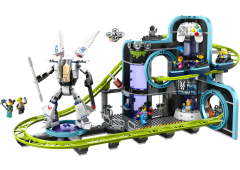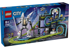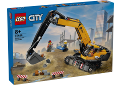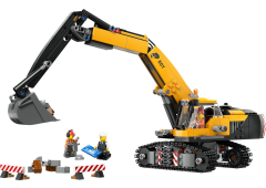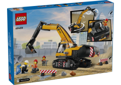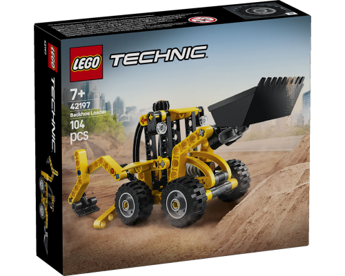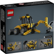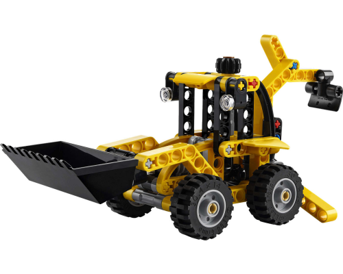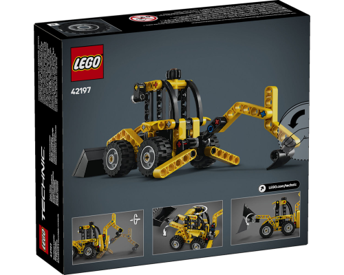 Deze bouwset voor kinderen bevat een bouwbare LEGO Technic Graaflaadmachine met een laadschop, steunpoten en een graafarm aan de achterkant.