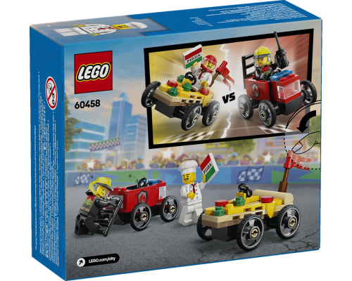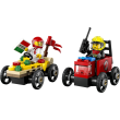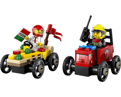 Met dit LEGO City Raceautopakket: pizzabestelwagen vs. brandweerauto kun je 2 zeepkisten bouwen met een chef-kok en brandweerlid als coureurs.