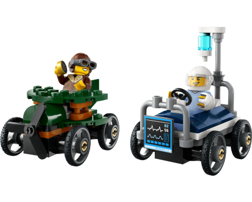 Met dit LEGO City Raceautopakket: vliegtuig vs. ziekenhuisbed kun je 2 zeepkisten bouwen met een piloot en patiënt als coureurs.