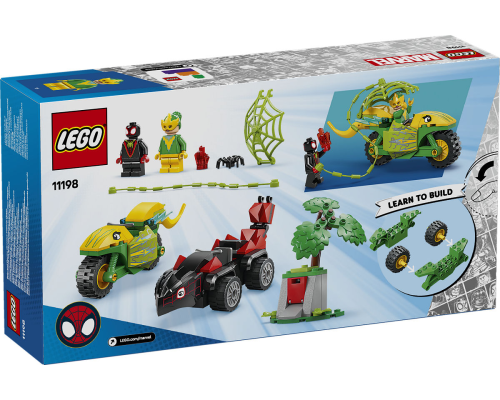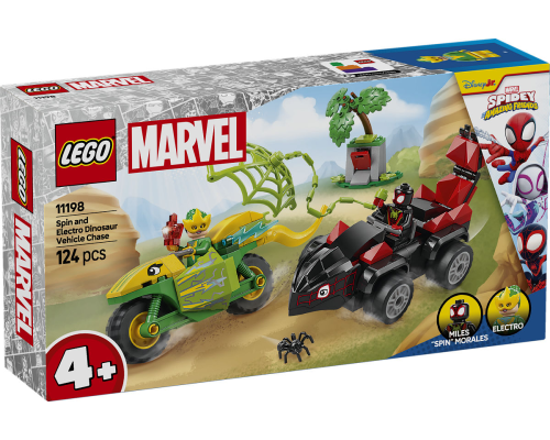 LEGO Spidey en zijn geweldige vriendjes Spin en Electro achtervolging met dinosaurusvoertuigen biedt kinderen vanaf 4 jaar creatief speelplezier.