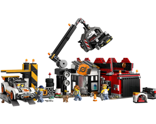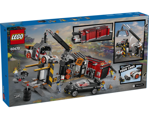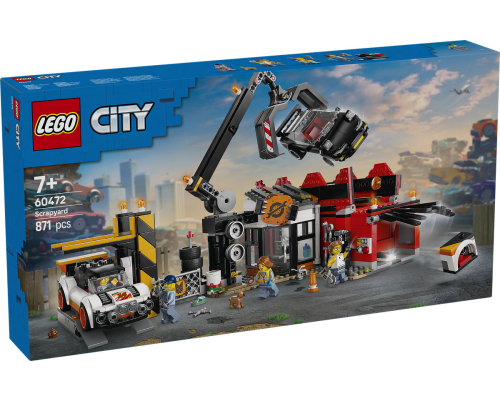 Recyclen wordt nog cooler met de LEGO City Schroothoop met auto's speelset, inclusief autopletter, grijpkraan, 2 aanpasbare auto's en 4 minifiguren.