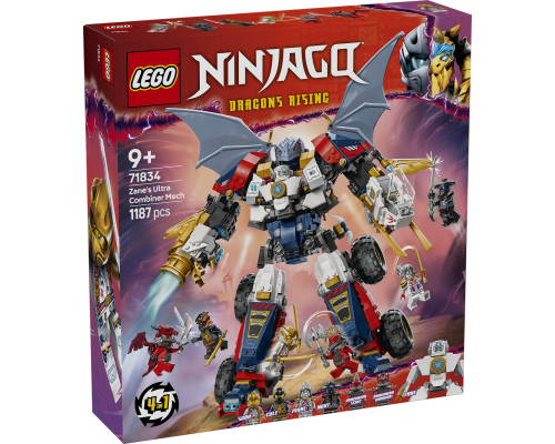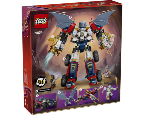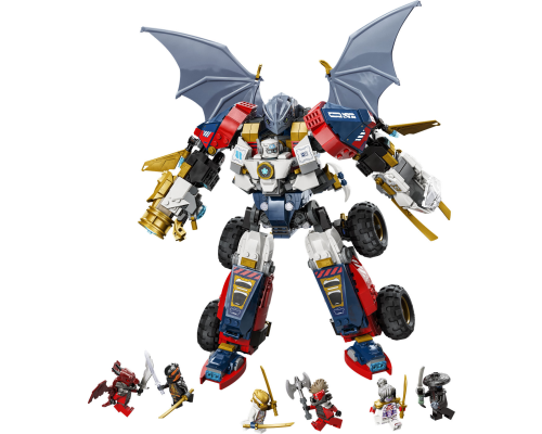 Fans spelen met een grote mecha of verdelen hem in een vliegtuig, auto, draak en actiefiguur in deze LEGO NINJAGO 4-in-1 bouwset met 6 minifiguren.