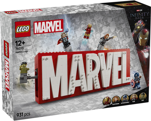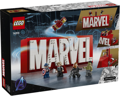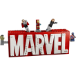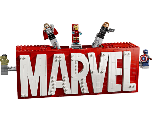 De bouwbare superheldendisplayset LEGO Marvel: MARVEL logo en minifiguren is een Marvel verzamelobject met 5 beroemde personages.