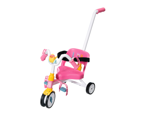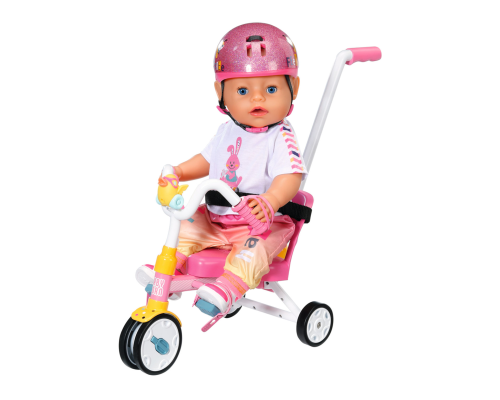 Pas op, hier komt BABY born! Op haar nieuwe driewieler houdt ze een wedstrijdje met Teddy en Eva. Dankzij de echt werkende wielen kan BABY born fietsen als op een echte driewieler. Met de toeter in de vorm van Berta de eend zorgt ze ervoor dat niemand haa