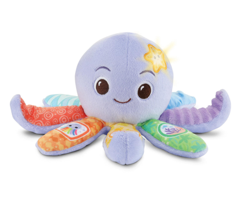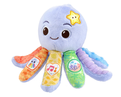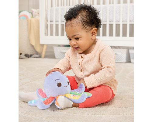 Deze lieve octopusknuffel heeft maar liefst 8 armen om je mee te knuffelen! De 8 armen bevatten verschillende materialen, texturen en patronen die de tastzin en de visuele ontwikkeling stimuleren. Druk op de 3 interactieve toetsen om lieve zinnetjes, grappige geluiden en gezongen liedjes te horen. Tijd om te knuffelen!