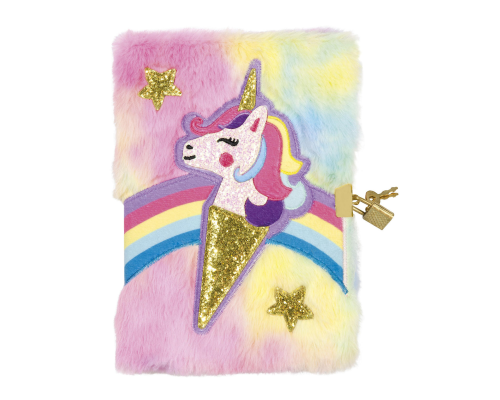 Fluffy Unicorn geheim dagboek met gouden slot en 2 sleutels, harde kaft bekleed met zachte aaibare stof in regenboogkleuren en luxe applicatie met glitterstof en geborduurde unicorn manen. 70 geliniëerde pagina's met unicorn print, binnenzijde kaft met fu