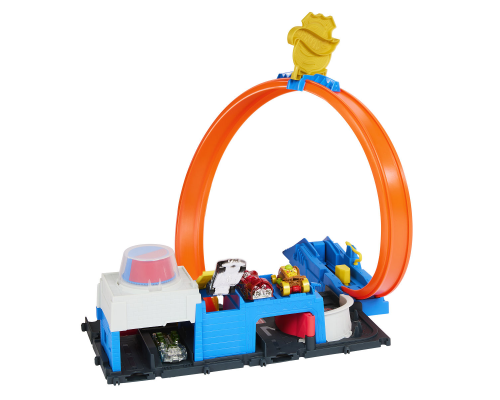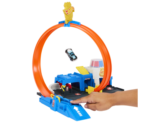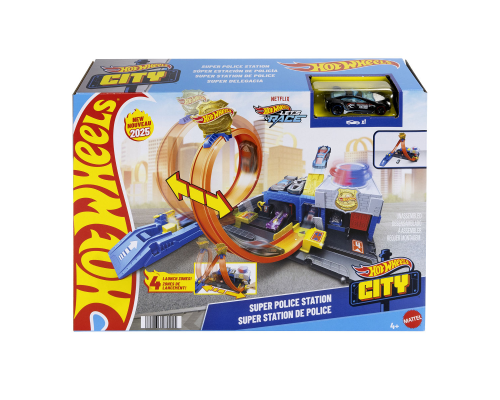 Je kunt op vier verschillende manieren racen en stunten op de aanpasbare racebaan bij het Hot Wheels City Superpolitiebureau! Rij met de meegeleverde metalen politieauto (schaal 1:64) in de lanceerder en tank de auto vol met de flexibele slang voordat de actie begint. Schuif de loopingbaan in een van de vier posities - elke positie heeft andere mogelijkheden om te racen en te stunten. Parkeer tot vier voertuigen op de set en koppel andere banen en speelsets voor nog meer speelplezier. Er is 1 auto inbegrepen, extra voertuigen en banen zijn apart verkrijgbaar. Afwijkende kleuren en versieringen mogelijk,